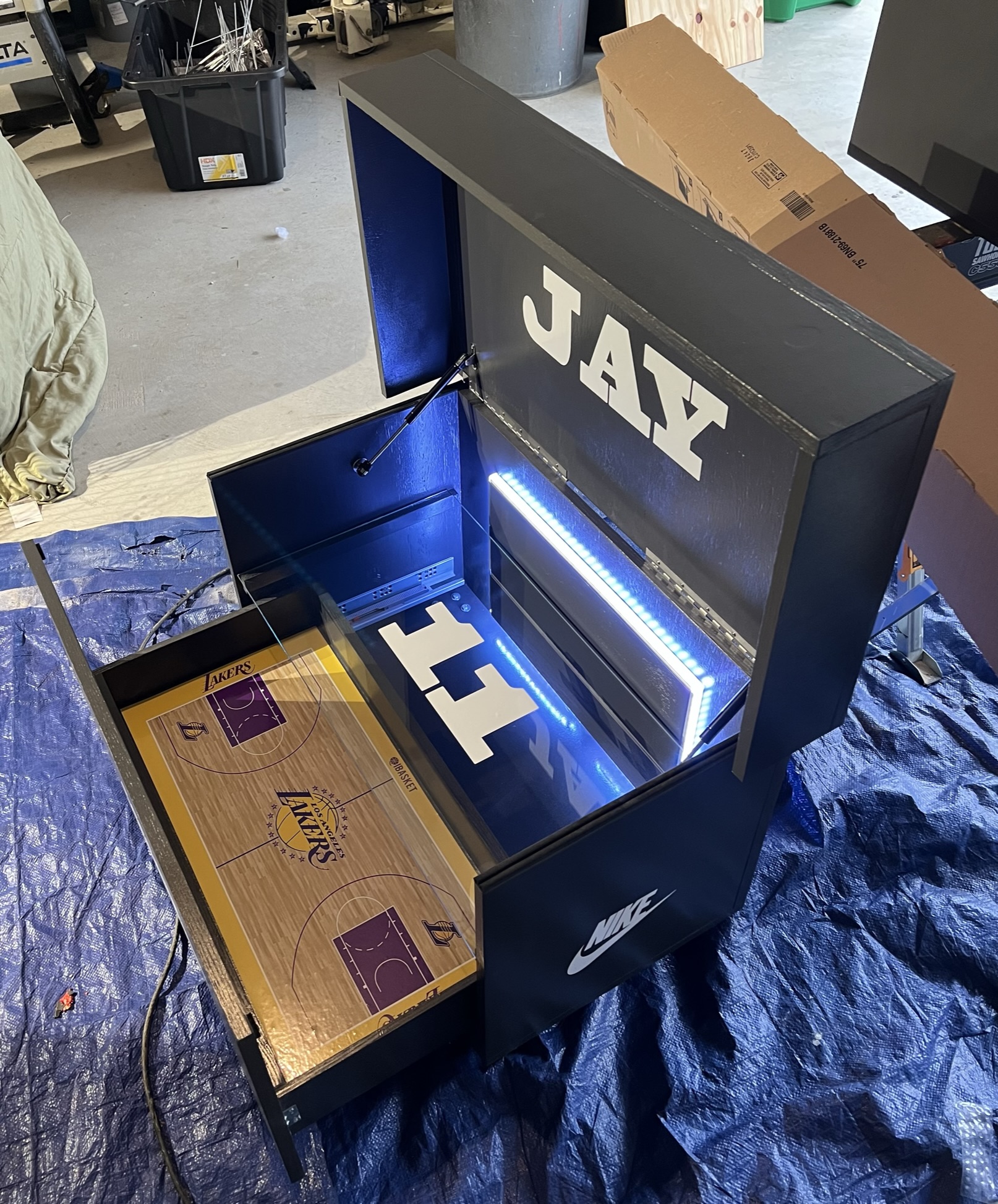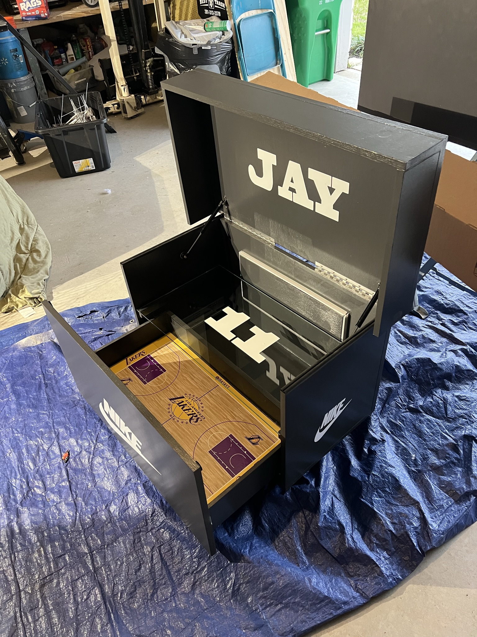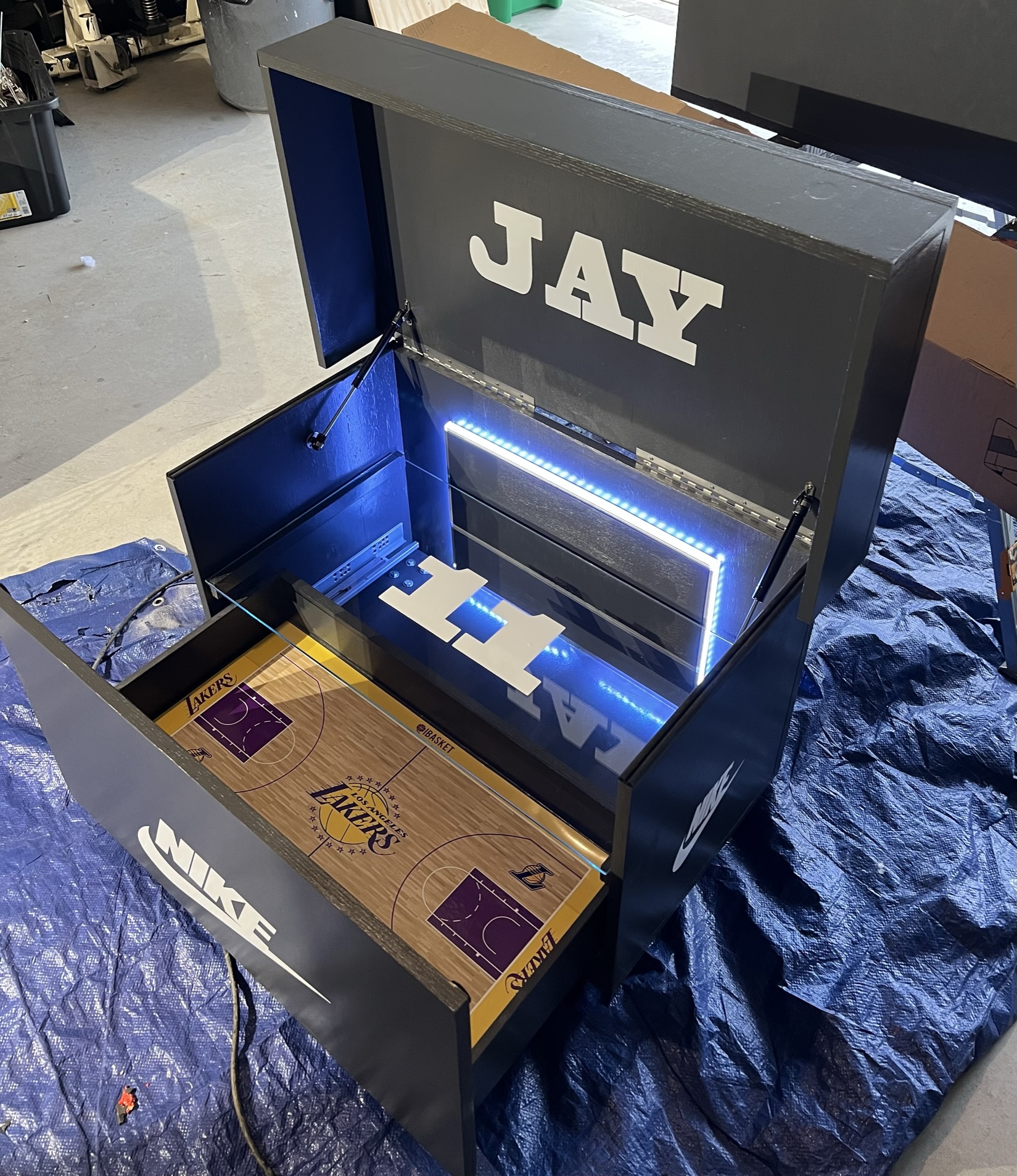 Each one is custom-built in Houston, TX, combining precision woodworking, luxury finishes, and creative freedom. From the sleek matte black exterior to the illuminated interior and court-themed floor, every detail reflects pride, presence, and personal legacy.