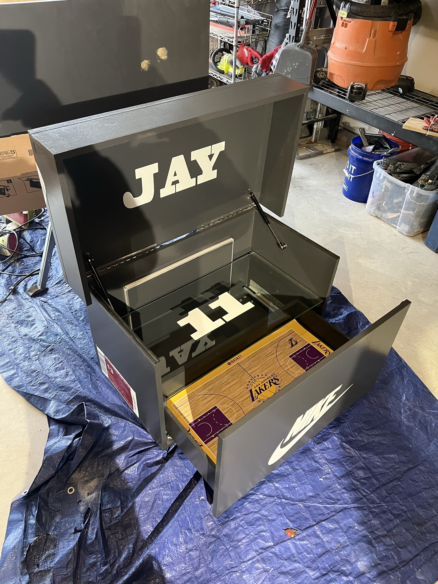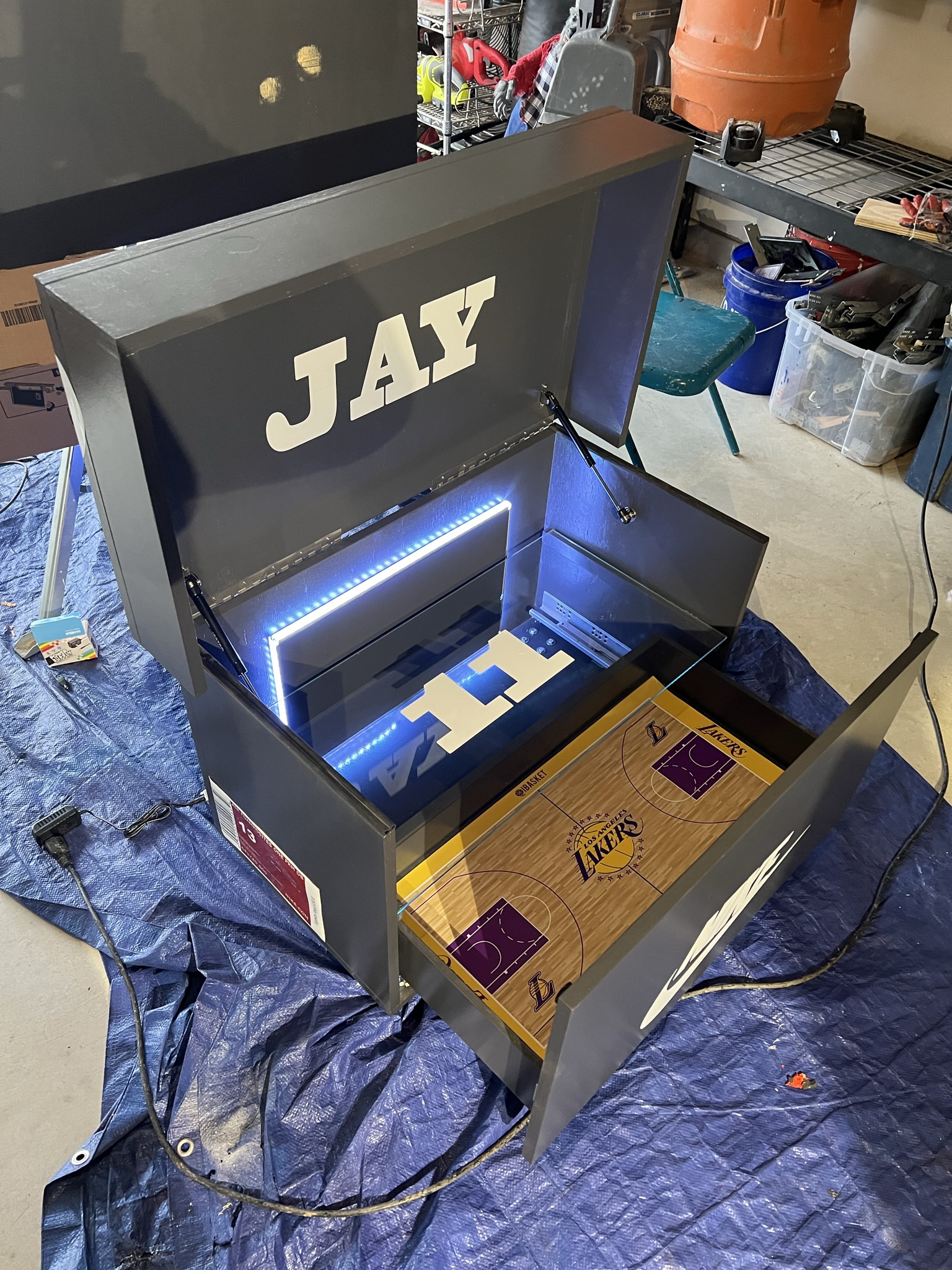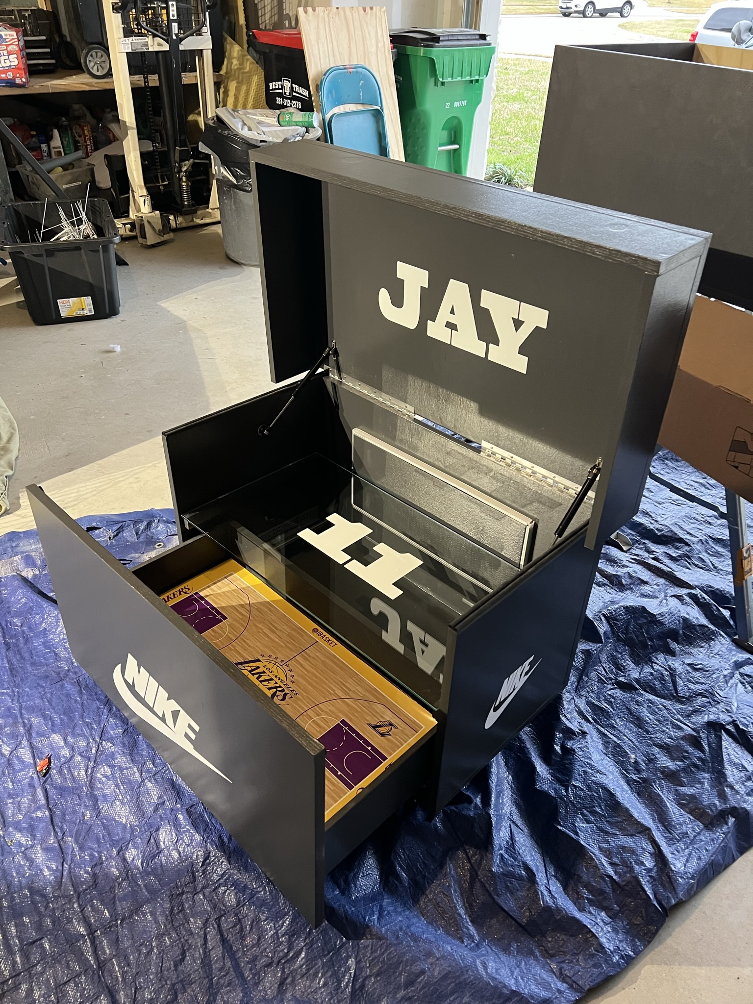 Each one is custom-built in Houston, TX, combining precision woodworking, luxury finishes, and creative freedom. From the sleek matte black exterior to the illuminated interior and court-themed floor, every detail reflects pride, presence, and personal legacy.
